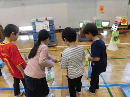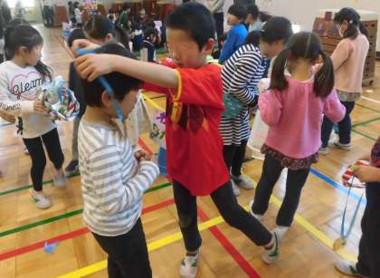 「わなげやコーナー」です。手作りの輪とペットボトル的を一生懸命に作った1年生。そのおかけでみんな輪投げを楽しめました。たくさんの景品も作り、プレゼントする姿からもお兄さん、お姉さんらしいやさしさを発揮していました。