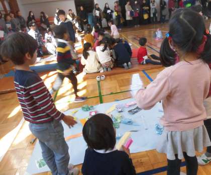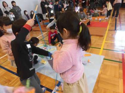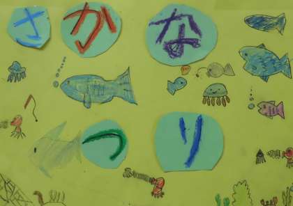 「さかなつりコーナー」です。そばで一生懸命に声をかける1年生。上手にできるようにアドバイスする姿からお兄さん、お姉さんらしさを感じました。手作り魚もいっぱい泳いでいました。