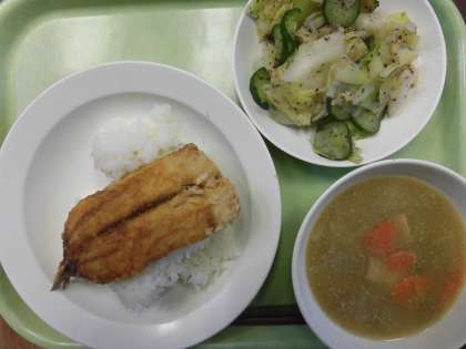 今日の給食は、いわしのかば焼き丼・牛乳・根菜のごまみそ汁・野菜のゆかりかけです。