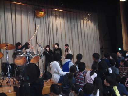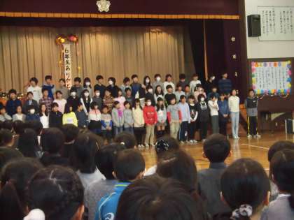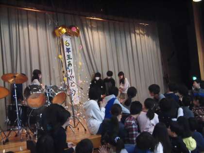 代表委員会の子供たちがていねいに作った「くす玉」を6年生が糸を引きました。「5・4・3・2・1・0」の声。「おめでとう」の声を届けたいという全校児童の気持ちが高まったせいか「0」の声を聞くと同時にくす玉が割れました。みんな笑顔です。「6年生ありがとう」の文字が全校児童の心を表しています。