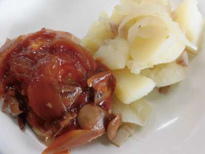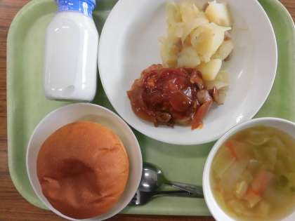 今日の給食は、丸パン・牛乳・豆腐入りハンバーグ・ジャーマンポテト・きゃべつスープです。