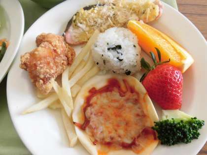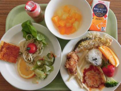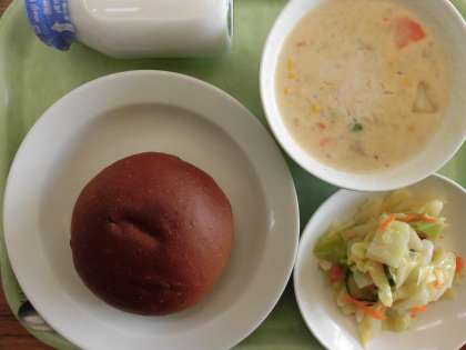 今日の給食は、チョコチップパン・牛乳・コーンシチュー・フレンチサラダです。