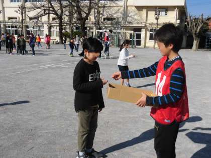 集会は大成功でした。この集会の準備を中心的にしたのは5年生の集会委員です。6年生と全校のみんなに喜んでもらうために朝から練習に励みました。休み時間を使って作ったメダル。手作りのメダルをみんなが喜んでくれました。