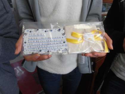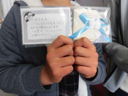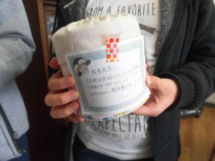 卒業を前にして6年生が家庭科の時間に、学校に残すプレゼントを作りました。トイレットペーパーケースとカーテンホルダーです。心のこもったプレゼントをいただき、学校の多くの場で6年生の作品が飾られました。校長室にも、すてきな言葉と笑顔を添えて・・・届けてくれました。間もなく卒業だと思うと感無量です。最後まで池之上小学校で思いでたくさんつくってほしいと願っています。