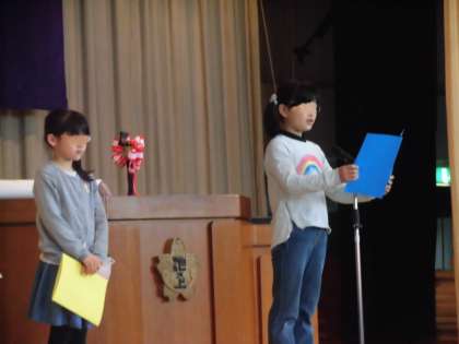 平30年度の修了式を行いました。今日をもって1年間の学びが修了します。1年間を振り返ってがんばったことや次年度の目標を2年生と4年生の代表児童が発表しました。子供たちの言葉からもたくさんの努力と成長を感じました。修了式では「修了証」を代表児童に授与しました。みんなほんとうによくがんばりました。大きく成長しました。たくさんのことを経験し、その一つ一つの経験を糧にして、4月からは中学校進学、一つ上の学年への進級が待っています。皆で努力をたたえ合いました。