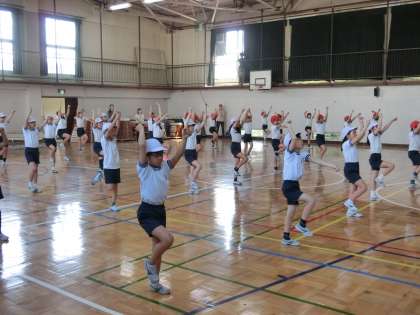 まだ、体育館での練習ですが、校庭に出て、どんな隊形で