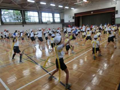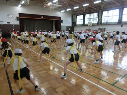 2校時の5,6年生は、体育館で、「躍動」の動きの確認です。
