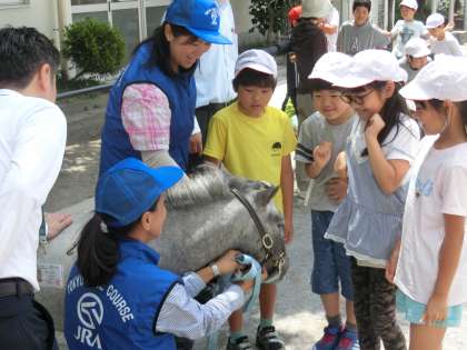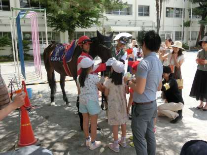 3,4年生は、校庭にやってきたサラブレット、ポニーなど本物の馬に