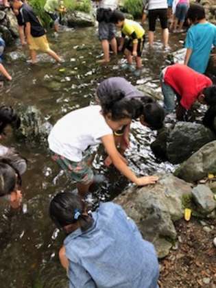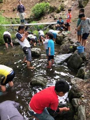 川場移動教室、二日目午後のお楽しみは、マスのつかみ取り。これも都会では、なかなかできない体験。子供たちは、歓声を上げながら、マスつかみに熱中していました。