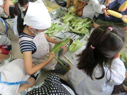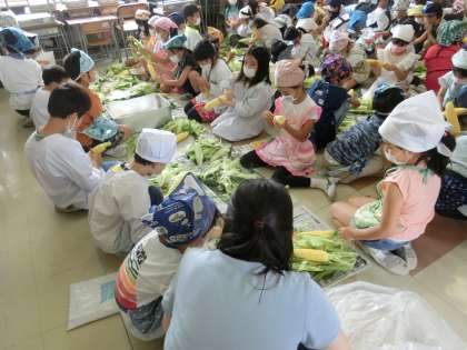 11時ごろ、給食室から茹でとうもろこしの甘—い香りがしてきました。