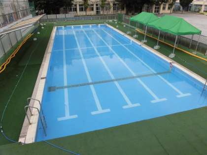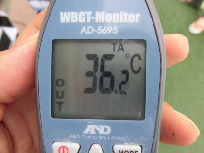 プールサイドは、日かげでも気温が36度越えです。息苦しくなるほどの暑さです。