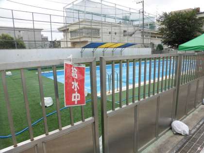 水泳指導は、高・中・低学年で、水位を変えて行います。明日の1回目(高学年)の準備のため、プールに水を入れています。この札は、注水(排水)が、お互いに確認できるよう、掲げています。