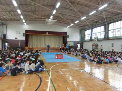 避難場所を体育館に変更し、全児童が体育館に避難しました。