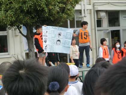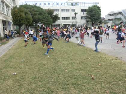 校庭のあちらこちらに集会委員会児童が事前に仕掛けた宝物が