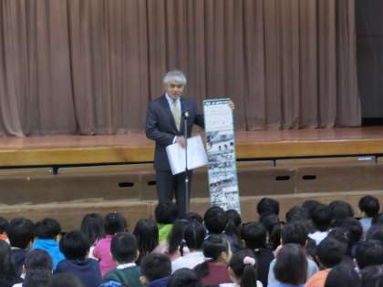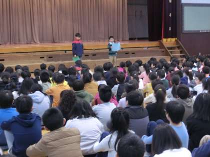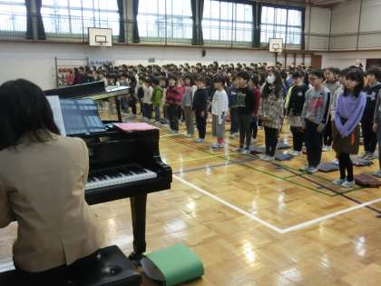 で、始まり、担任が「元気な笑顔」を前から一人ずつ確かめます。