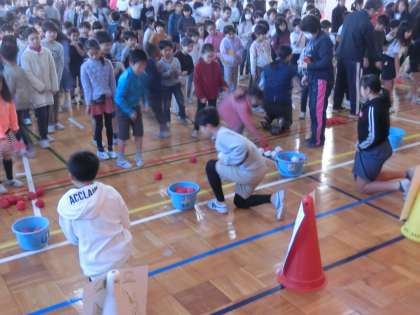 あとは、それに倣って、全校児童が“紅白玉まき”を楽しんでいました。