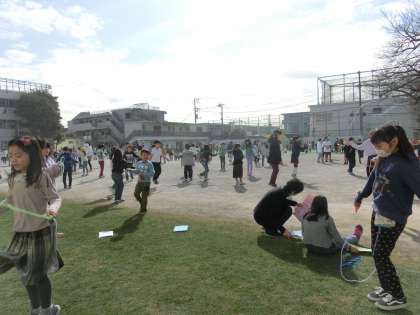 5,6年生が、下学年の跳んだ回数を数えたり、