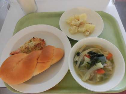 本日の給食は、ミルクパン、さけのガーリック焼き、じゃがいものクリームあえ、ヌードルスープ、牛乳です。
