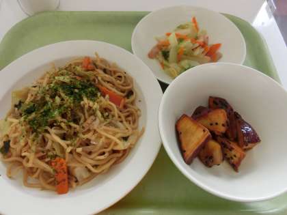 本日の給食は、ソース焼きそば、白菜のあえもの、大学いも、牛乳です。