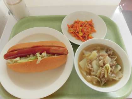 本日の給食は、ウインナーサンド、白いんげんの田舎風スープ、にんじんサラダ、牛乳です。