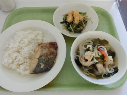 本日の給食は、麦ごはん、さわらの西京焼き、カリカリ油揚げと野菜のひたし、牛乳です。