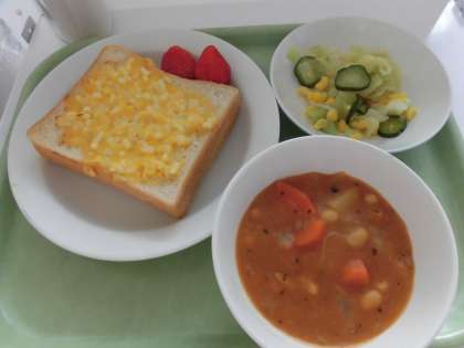 本日の給食は、たまごトースト、ビーンズシチュー、コーン入りフレンチサラダ、いちご、牛乳です。