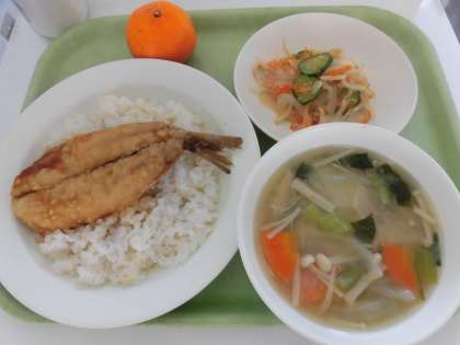 本日の給食は、いわしのかば焼き丼、こんにゃくサラダ、みそ汁、ぽんかんです。