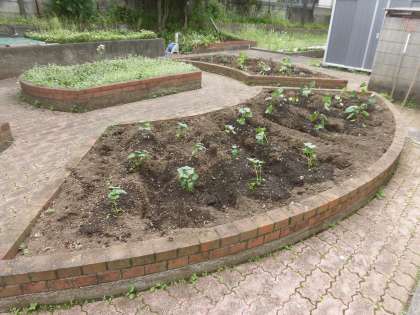 2年生の畑の野菜がすくすく育っています。育てている野菜は,キュウリ,トマト,オクラ,ナスです。今週中に子供たちが観察をします。実がなるのが楽しみですね。