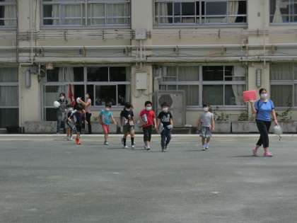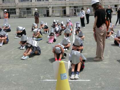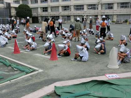 10時25分までに登校している全児童が校庭に一時避難しました。