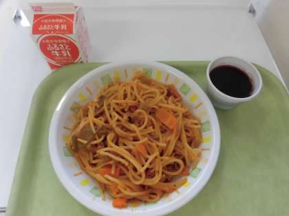 本日の給食は、スパゲティナポリタン、ブドウゼリーです。教員のみの配膳のため、簡易給食になっています。