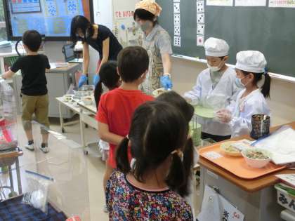 今日の給食、献立は、五目冷やしうどんとお豆かりんとうです。