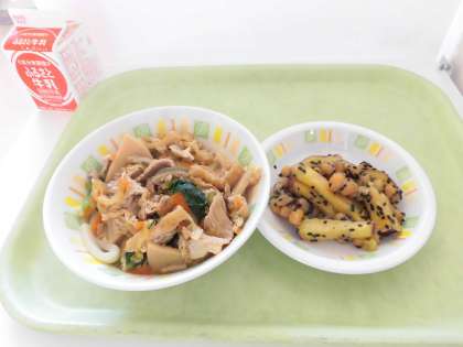 本日の給食は、五目冷やしうどん、お豆かりんとう、牛乳です。