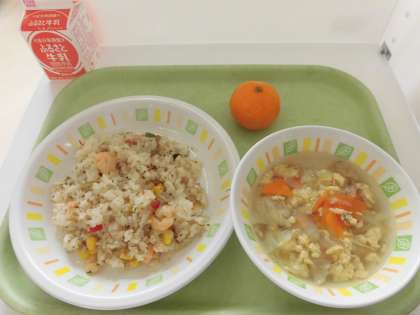 今日の給食は、ナシゴレン、卵とチーズのふわふわスープ、冷凍みかんです。