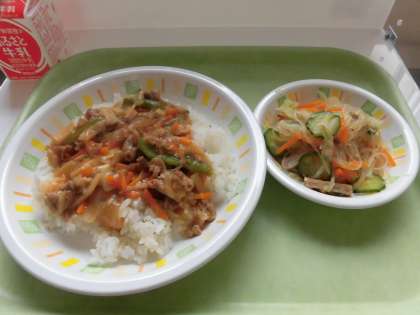 今日の給食は、スタミナ丼、春雨サラダです。