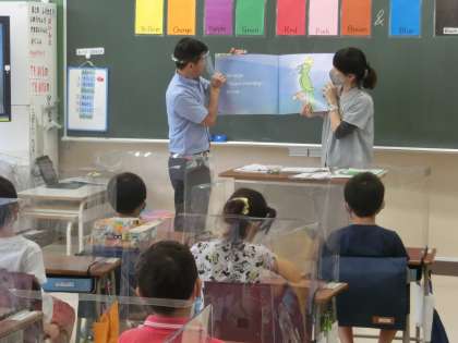 Ki先生と担任の掛け合いで読み聞かせ。