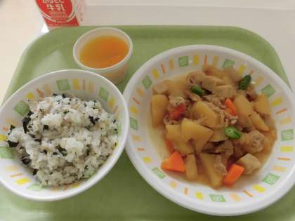 今日の給食は、わかめとじゃこのごはん、肉じゃがうま煮、みかんゼリーです。