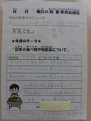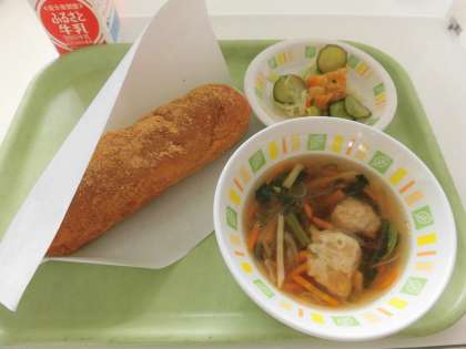 今日の給食は、きな粉あげパン、肉団子入り春雨スープ、パリパリサラダです。
