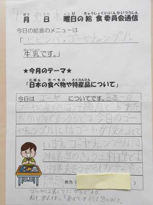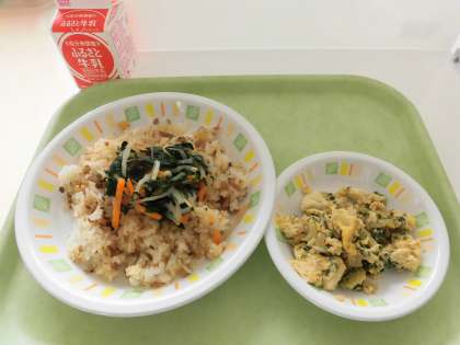 今日の給食は、ビビンバ、ゴーヤチャンプルです。