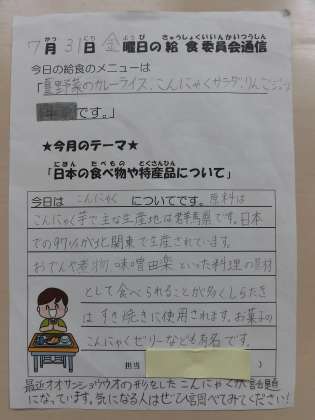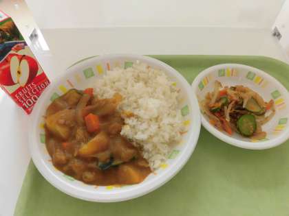 今日の給食は、夏野菜のカレーライス、こんにゃくサラダ、リンゴジュースです。