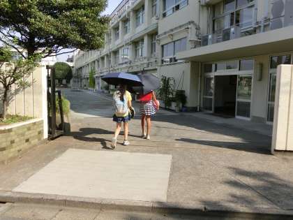 今日は日傘をさしながらの児童もいるほど