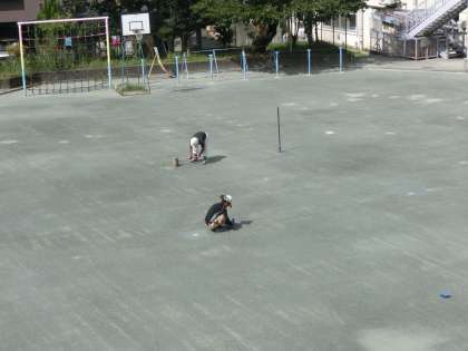校庭では、暑い中ですが、工事業者の方々が校庭整備作業してくれています。