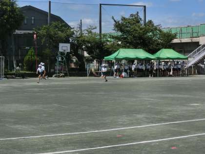 記録を測る子供たちは、日差しを受けてトラックを走りますが、