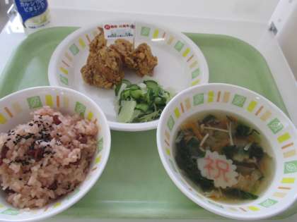 今日の給食は、赤飯、鶏肉のからあげ、野菜のひとしお、沢煮椀、ジョアです。