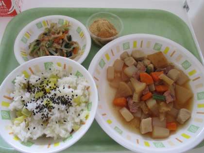 今日の給食は、さつまいもごはん、豚肉と大根のうま煮、野菜のおかかかけ、月見だんご、牛乳です。