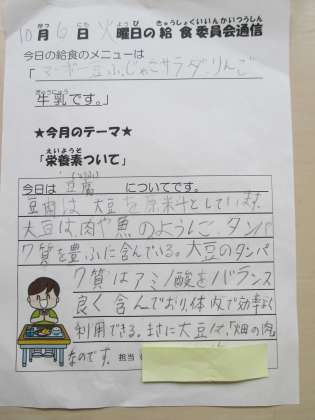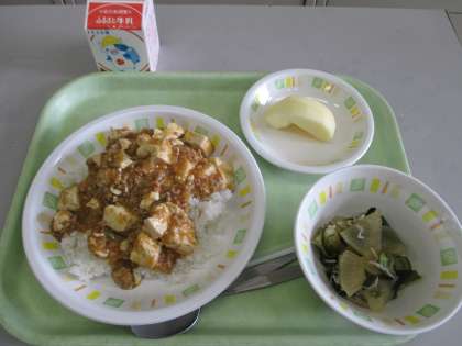 今日の給食は、麻婆豆腐丼、じゃこサラダ、りんごです。