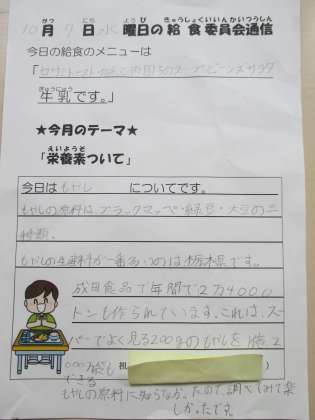 今日の給食は、セサミトースト、白菜と肉団子のスープ、ビーンズサラダ、牛乳です。