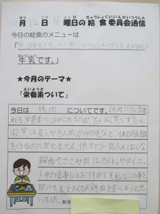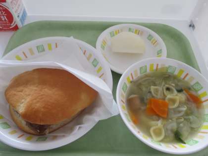 今日の給食は、照り焼きチキンバーガー、マカロニスープ、なし、牛乳です。