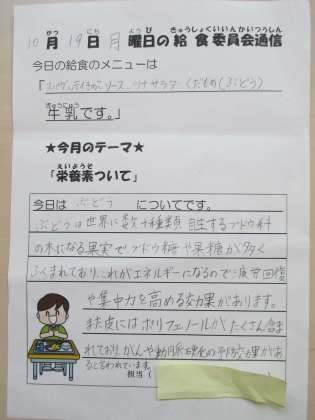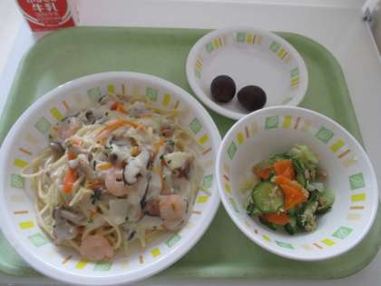 今日の給食は、スパゲティきのこソース、ツナサラダ、巨峰、牛乳です。