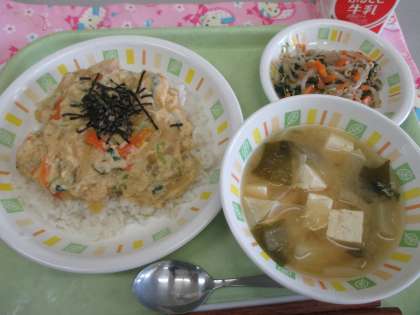 献立は、親子丼、三色ナムル、みそ汁、牛乳です。