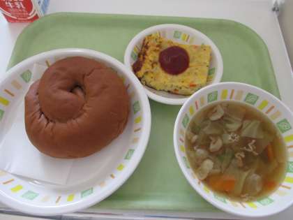 今日の給食は、ココアパン、スペイン風オムレツ、白いんげんの田舎風スープ、牛乳です。